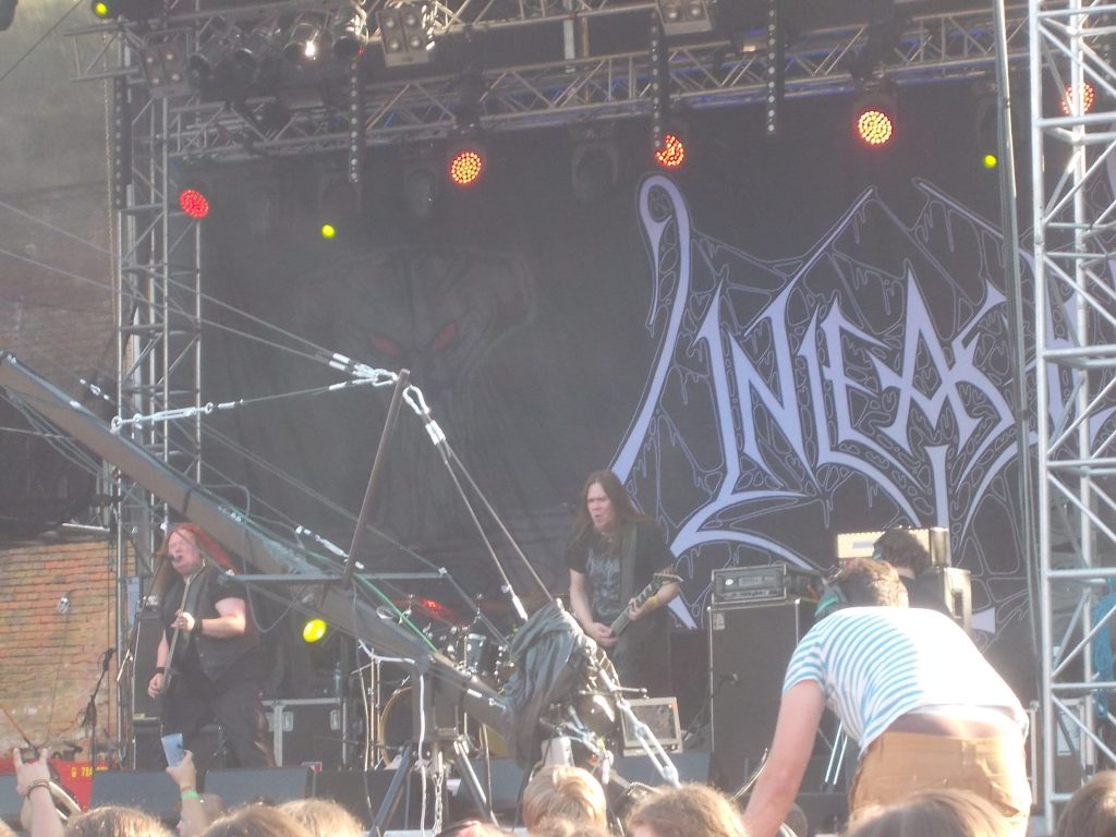 Pojawiłem się dopiero na ONSLAUGHT, bo ich ostatnie płyty są po prostu rewelacyjne. Dobrej próby Thrash i tak też było na koncercie. Dobre, solidne łupnięcie z przytupem. Starzy wyjadacze dali radę. Po nich MISERY INDEX. Uwielbiam tych jankesów. Zawsze dają z siebie 110% mocy i także  było tym razem. Death metalowy jad sączył się z głośników i dewastował publiczność pod sceną. Krótko i na temat. Dwie kapele dalej i CROWBAR określany kiedyś najcięższym bandem świata (grało tam kiedyś  trzech wagowych zawodników). No i zagrali też ze sporym ciężarem. Taki stu tonowy walec przetoczył się po scenie, później zjechał ze sceny i miażdżył ludzi 😉 Taki stoner to ja rozumiem. Zaraz po nich poprawił 200 tonowy walec OBITUARY. No i tu wiadomo z czym się to je. Było mięsiście, ostro i do przodu, a John Tardy wypruwał z siebie flaki dosłownie. Jak na razie koncert festiwalu.